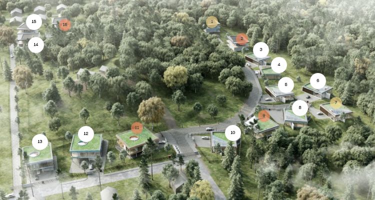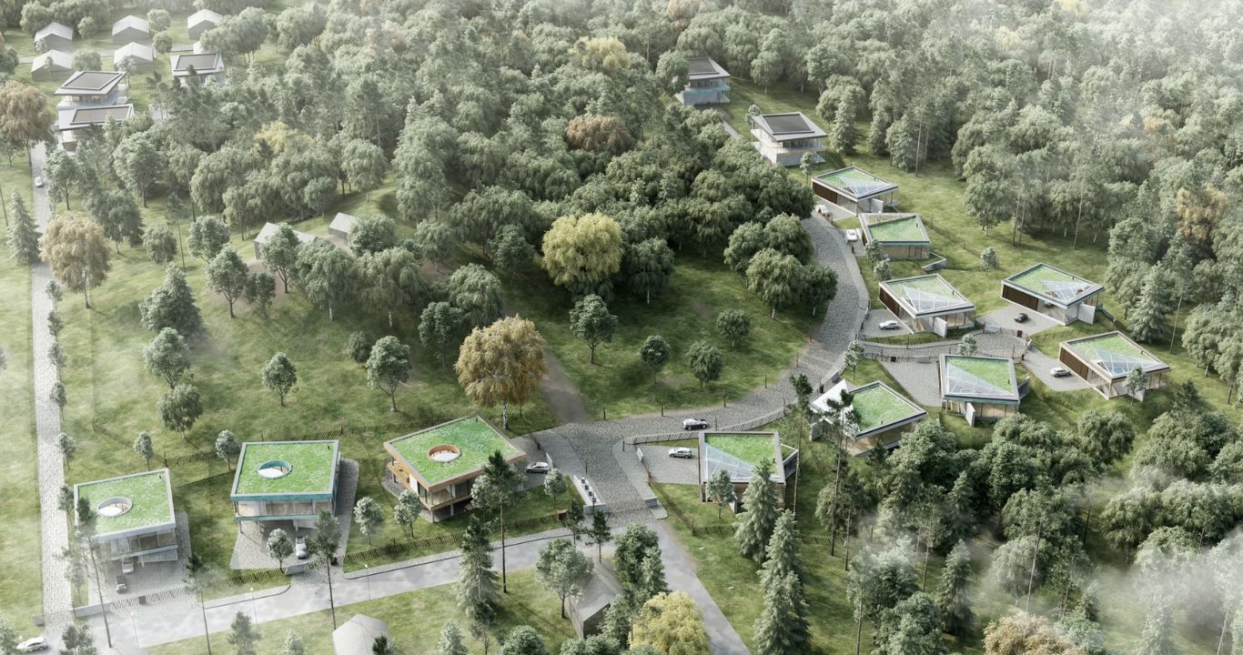 Kiekvienas gyvenamasis namas suprojektuotas iš dviejų tūrių: skaidraus gyvenamojo ir privataus šeimos poilsio.